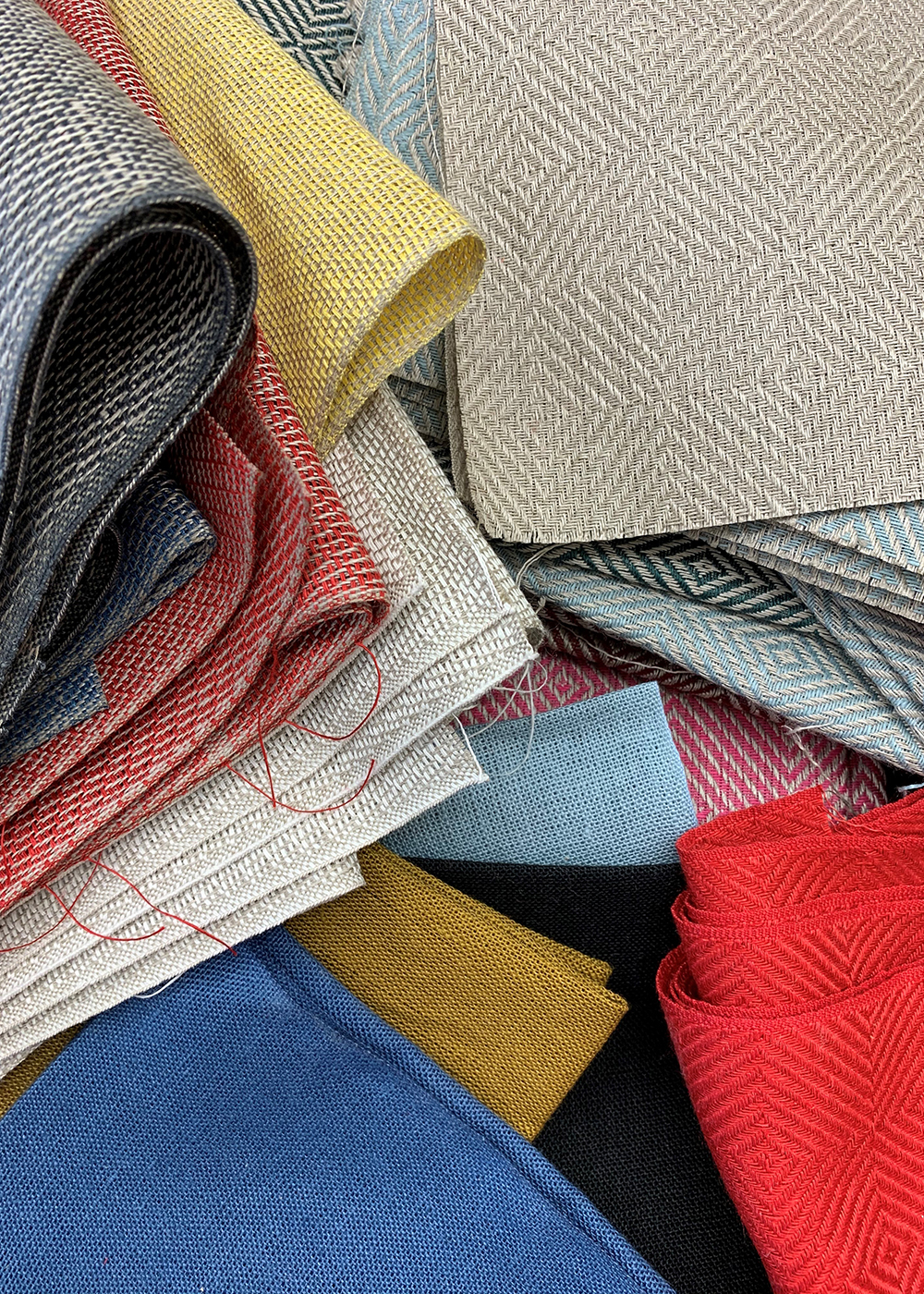 Små restbitar som kan bli över när vi syr kläder eller klipper upp i olika mått läggs i små påsar och säljs som ”fyndpåsar” i vår fabriksbutik till ett riktigt fyndpris.