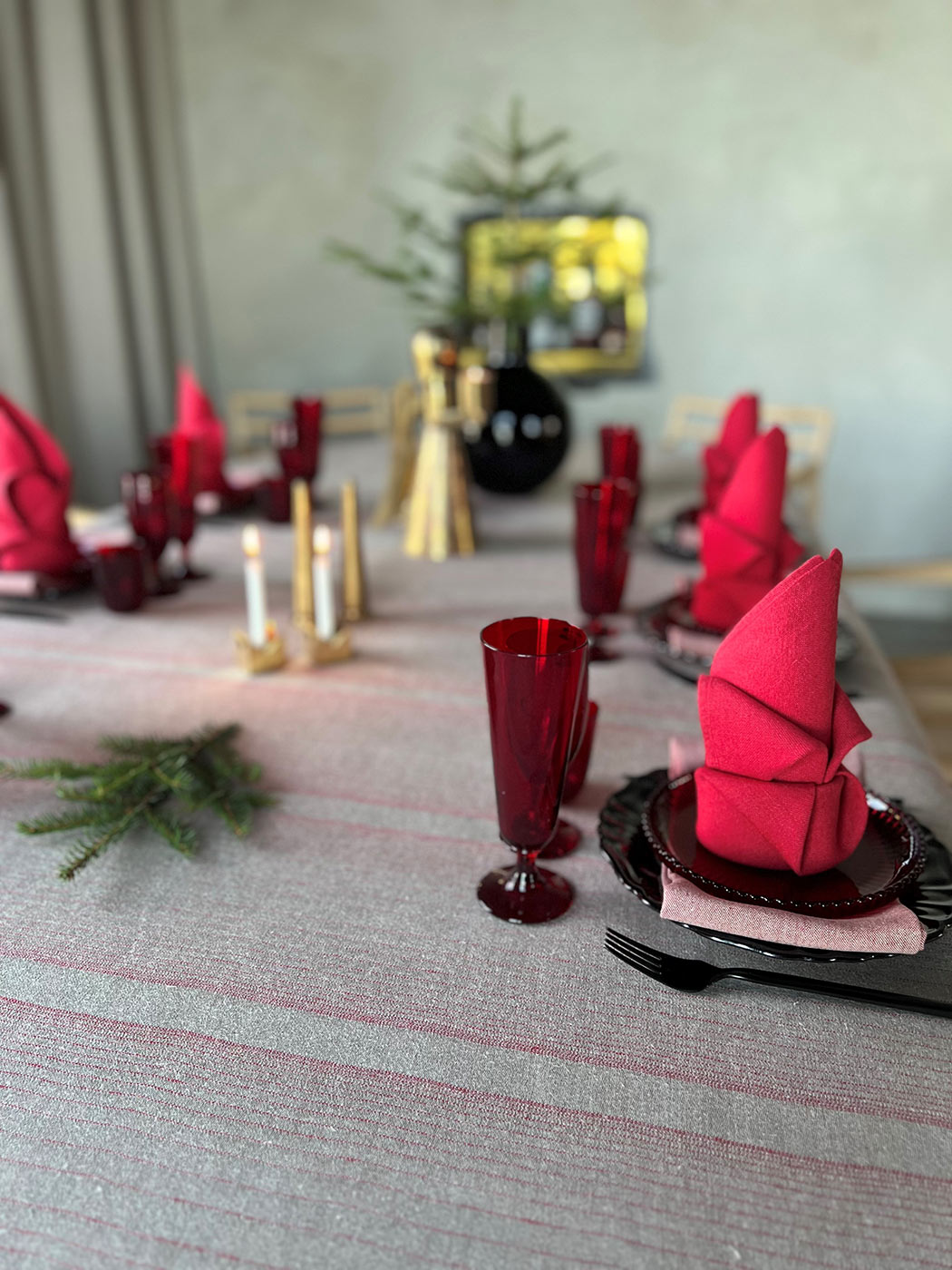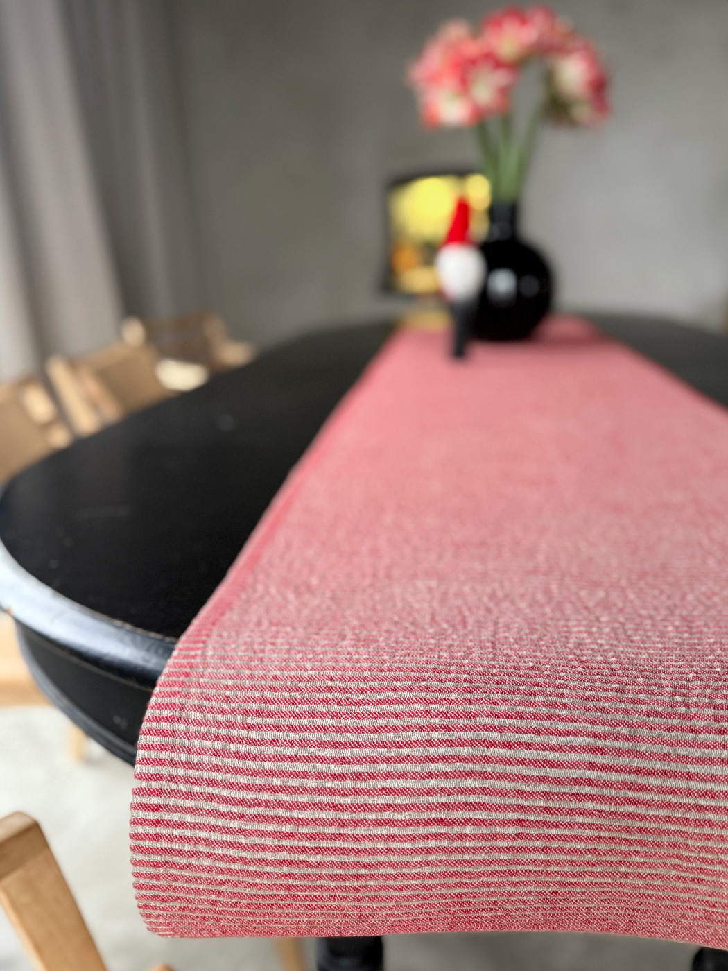 De tunna, streckade linjerna i svart eller rött mot den oblekta bottnen gör Streck till en duk som rör sig sömlöst mellan högtid och vardag. Den har en diskret elegans som gör att den lika gärna kan ligga framme i december som i juni — en tidlös textil skapad för många års användning.