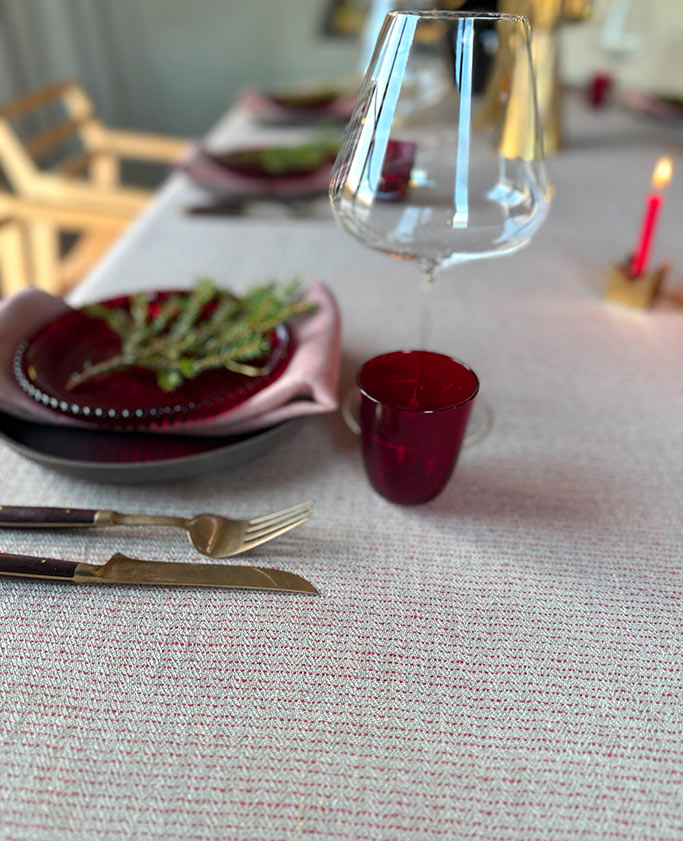 Inför årets jul längtade vi efter något nedtonat. Något naturligt, tunt och följsamt – men med en formkänsla som gör att duken bär julen utan att dominera den. Resultatet blev Streck, en ny linneduk vävd i spetskypert, en teknik som ger duken sitt mjuka fall och sin släta, levande struktur.